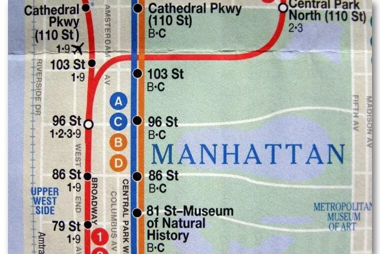 地图上的白点叫做 Express Stop,这样的站快车和慢车都会停靠,黑点叫做Local Stop,只有慢车才会停靠,一般来说4,5,6(绿色线)和1,2,3(红色线)中4,5和2,3是快车,6号和1号是慢车.