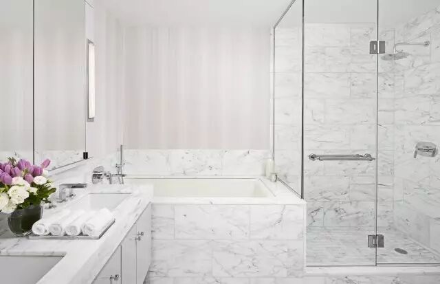 Jamie Drake独家定制浴室专属配件!盥洗室大气开阔,意大利Carrera白色抛光大理石极大地打开了空间的丰盈感,梳妆台精心配置Calacatta防溅挡板。简约中成就最精致的梳洗体验。