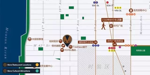 她地处曼哈顿中城黄金地段。步行5分钟到达时代广场、最繁华的步行街及15条地铁线最密集的枢纽站;步行15分钟亲临如洛克菲勒中心、辉瑞与时代华纳等诸多世界500强企业总部。