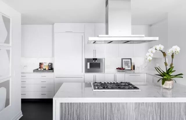 厨房采用白色烤漆橱柜,配有流线型白色带深色纹理的大理石台,厨房电器全部选自顶尖德国品牌Gaggenau(嘉格纳)。