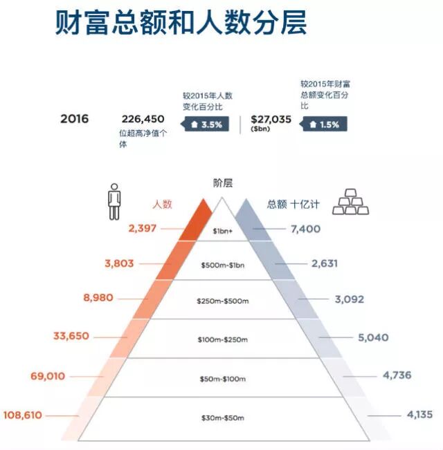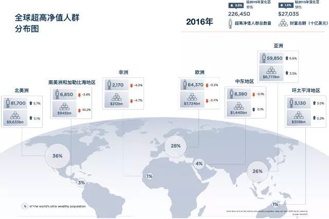截止2016年底,全球超高净值人群数量为226450位(拥有净值超3千万美元的则为超高净值个体),比2015年增长了3.5%。这些人群所持有的财富总额升至27万亿美元,较2015年增长了1.5%。