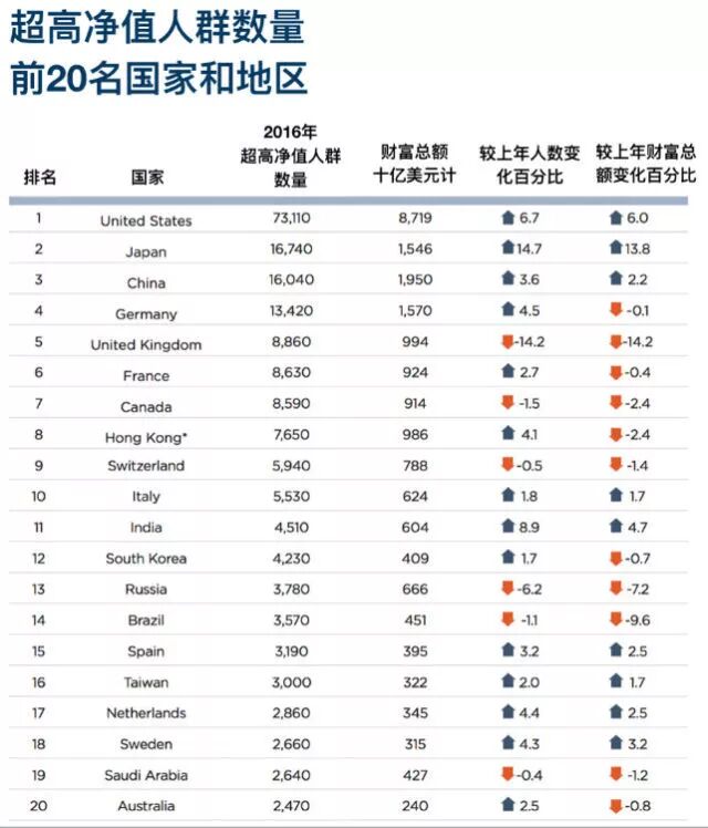 报告显示,全球超高净值人群人数最多的国家和地区仍然是美国,一共有73110人,较2015年增加了6.7%,积累财富总值8.7万亿美元。
