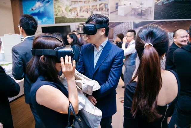 在美国上海建工广场二期·Tangram(二期)首发会现场,嘉宾们正通过包括VR投影在内的多种方式获悉此次Tangram项目的相关信息