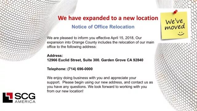 随着公司规模在奥兰治县( 橙县)进一步扩大,2018年4月5日,上海建工(美国)有限公司迁至12966 Euclid Street, Suite 300, Garden Grove CA 92840。